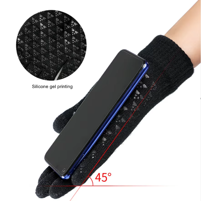 Feature: Skin-friendly, Comfortable and warm. Fingers use conductive materials and can touch the phone screen. Silicone covers the whole palm, being good anti-slip effect. Elastic wrist.
